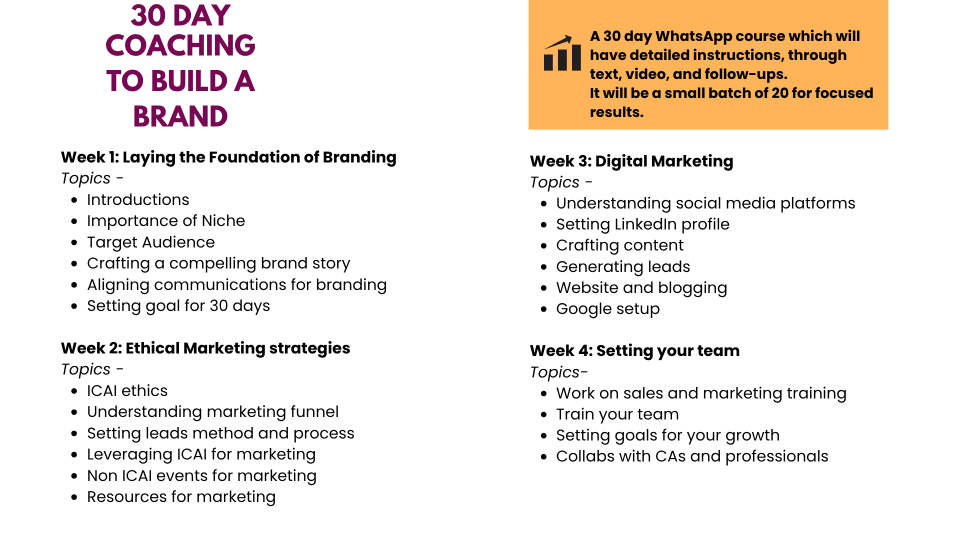 We help Chartered Accountants grow their practice through ethical personal branding, marketing, and client acquisition strategies. Our coaching is designed to help CAs attract the right clients, build credibility, and expand their professional presence while staying compliant with industry guidelines.